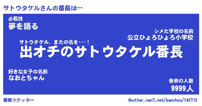 | ヒーロー風カッコイイあだ名 | 『スーパーサトウタケル』『炎刃騎士サト』 |