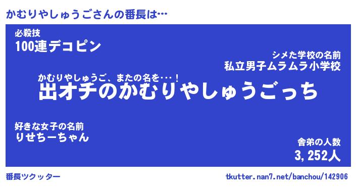 | 肩書あだ名 | 『かむりやしゅうご御曹司』 |