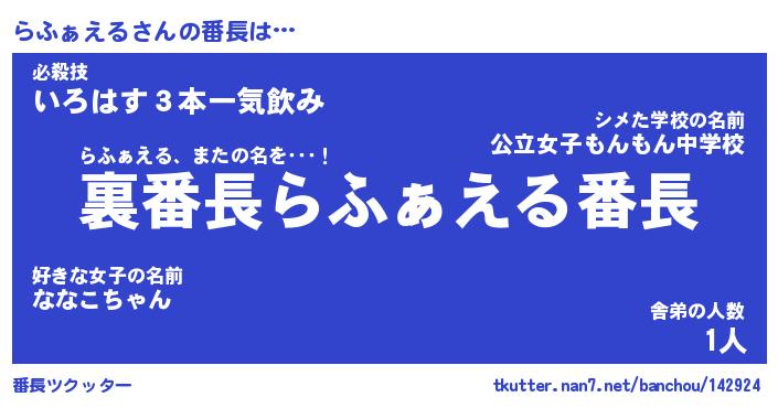 | 肩書あだ名 | 『らふぁえる店長』『らふぁえる総理大臣』 |