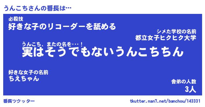 | ファンタジー風あだ名 | 『ウンフェル』『エターナルウンコチー』 |