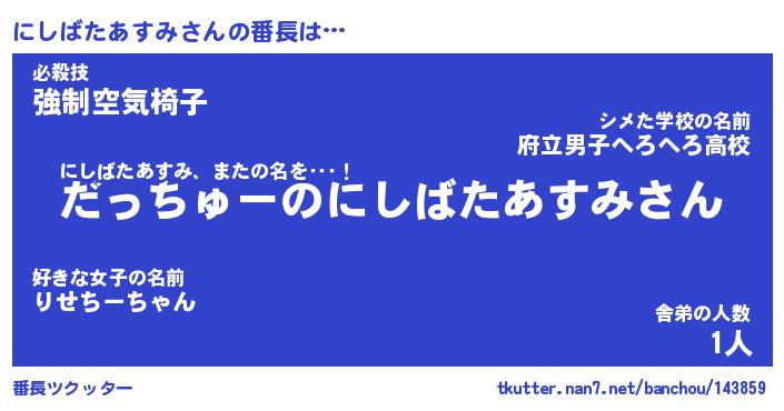 | ヘコむあだ名 | 『にしもー』『つくし』『にし太郎』 |