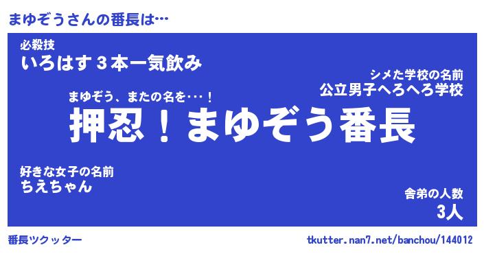 | 肩書あだ名 | 『まゆぞう御曹司』『まゆぞう国家主席』 |
