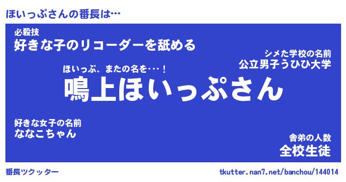 | ヘコむあだ名 | 『ほいもー』『酢こんぶ』『ほいっ子』 |