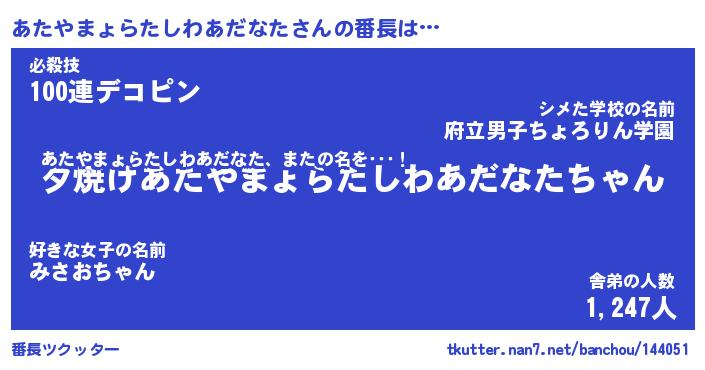 | ヒーロー風カッコイイあだ名 | 『スーパーアタヤマョラタシワアダナタ』 |