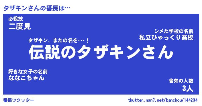 | 男性向けラノベタイトル風あだ名 | 『タザキンの憂鬱』 |