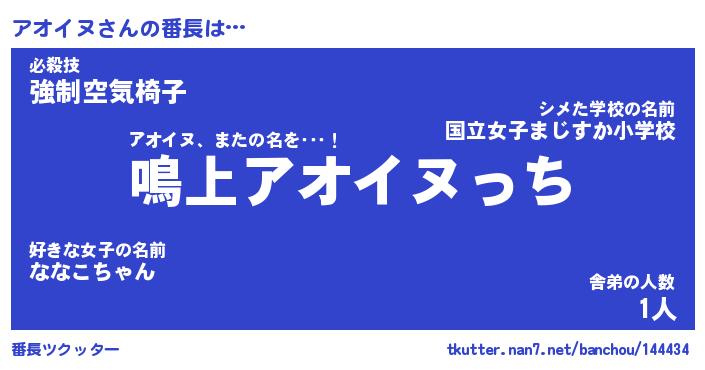 | 意味不明あだ名 | 『ペロリンアオイヌ』『永久保存アオイヌ』 |