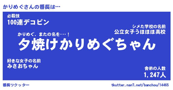 | 意味不明あだ名 | 『ペロリンかりめぐ』『永久保存かりめぐ』 |