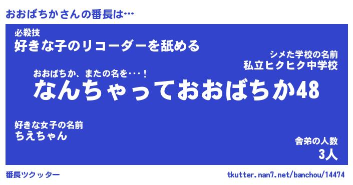 | 伝説のあだ名 | 『伝説のスナイパーおおばちか』 |