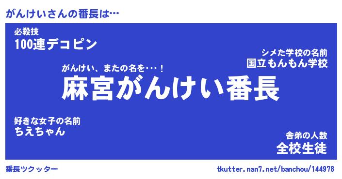 | 伝説のあだ名 | 『不死鳥のスナイパーがんけい』 |
