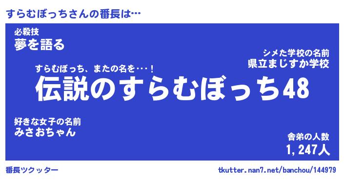 | 伝説のあだ名 | 『伝説のスナイパーすらむぼっち』 |