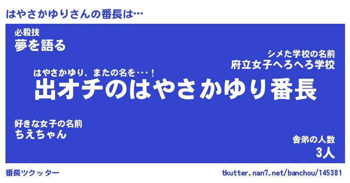 | 肩書あだ名 | 『はやさかゆりCEO』『はやさかゆり大統領』 |