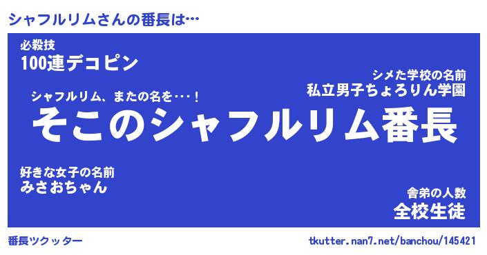 | ヒーロー風カッコイイあだ名 | 『スーパーシャフルリム』『魔戒騎士シャ』 |