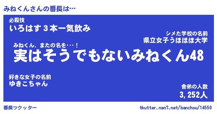 | 意味不明あだ名 | 『ペロリンみねくん』『永久保存みねくん』 |