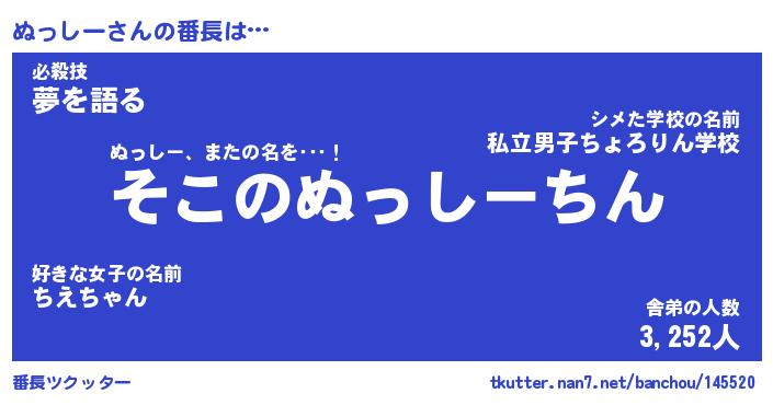 | 意味不明あだ名 | 『ペロリンぬっしー』『永久保存ぬっしー』 |