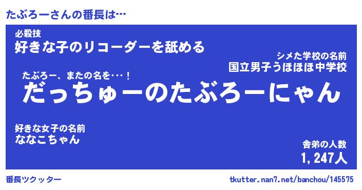 | 意味不明あだ名 | 『ペロリンたぶろー』『永久保存たぶろー』 |