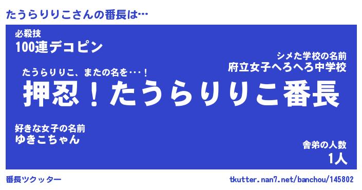 | 伝説のあだ名 | 『封印されしスナイパーたうらりりこ』 |