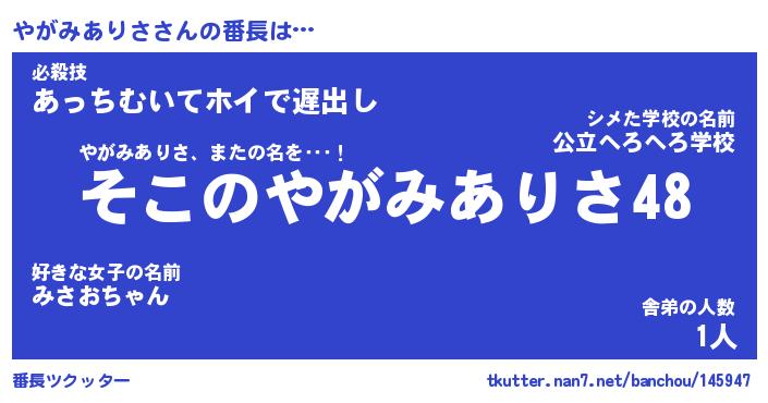 | 伝説のあだ名 | 『不死鳥の竜騎士やがみありさ』 |