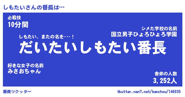 | 意味不明あだ名 | 『ペロリンしもたい』『永久保存しもたい』 |
