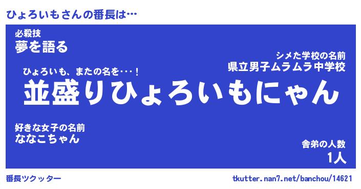 | ヘコむあだ名 | 『ひょにゅー』『豆乳』『ひょぷりん』 |