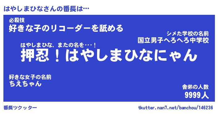 | ヒーロー風カッコイイあだ名 | 『スーパーハヤシマヒナ』『天弓騎士ハヤ』 |