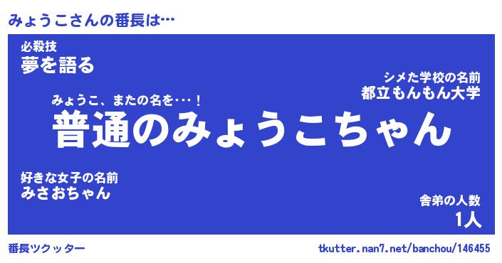 | 肩書あだ名 | 『みょうこ店長』『みょうこ大統領』 |