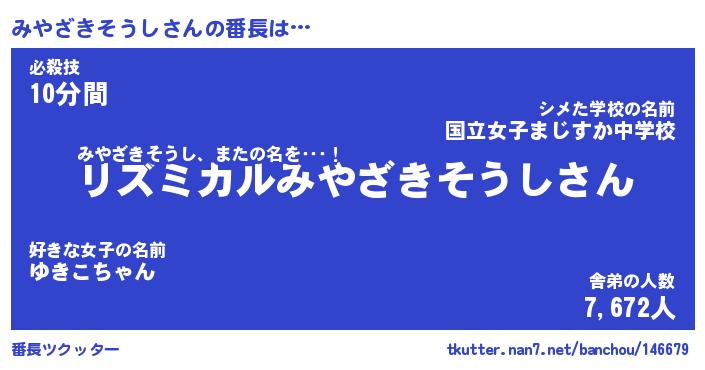 | ピコ太郎風あだ名 | 『ミコ史郎』『ピミ八郎』『ミヤ三郎』 |