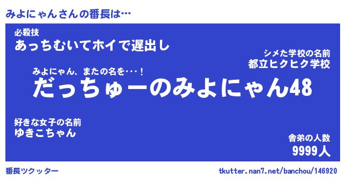 | ヒーロー風カッコイイあだ名 | 『スーパーミヨニャン』『天弓騎士ミヨ』 |
