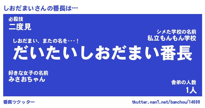 | 伝説のあだ名 | 『不死鳥のスナイパーしおだまい』 |