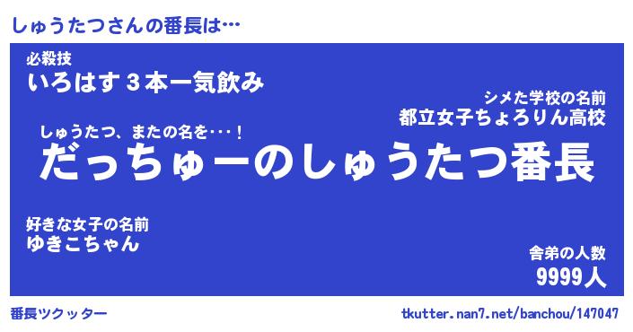 | 肩書あだ名 | 『しゅうたつ社長』『しゅうたつ大統領』 |