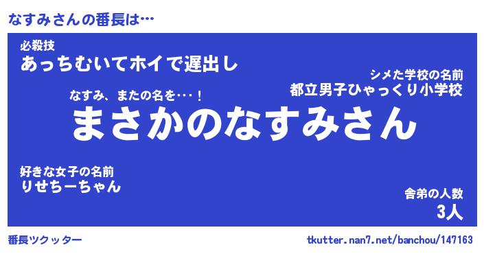 | 肩書あだ名 | 『なすみ店長』『なすみ総理大臣』 |