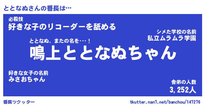 | 肩書あだ名 | 『ととなぬ社長』『ととなぬ総理大臣』 |