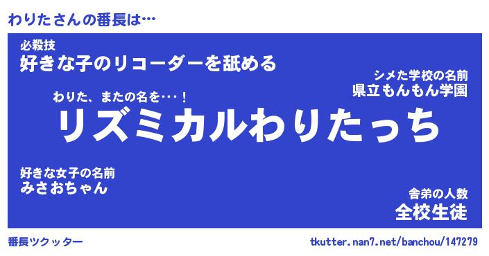 | ヒーロー風カッコイイあだ名 | 『スーパーワリタ』『ウルトラわりたマン』 |