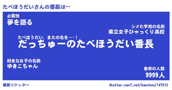| ヘコむあだ名 | 『たべにゅー』『豆乳』『たべ太郎』 |