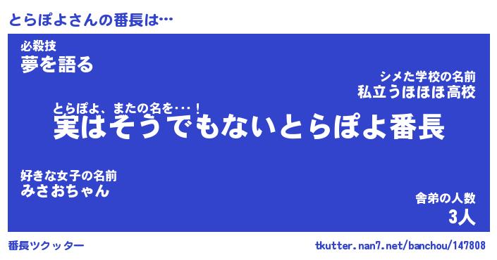 | 意味不明あだ名 | 『ペロリンとらぽよ』『永久保存とらぽよ』 |