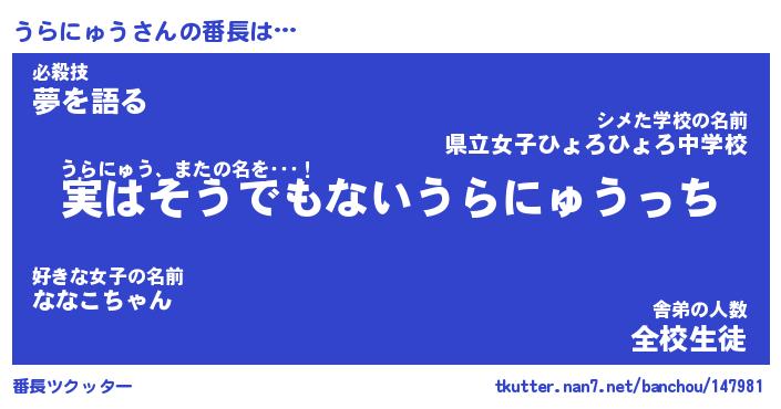 | 肩書あだ名 | 『うらにゅう御曹司』『うらにゅう班長』 |