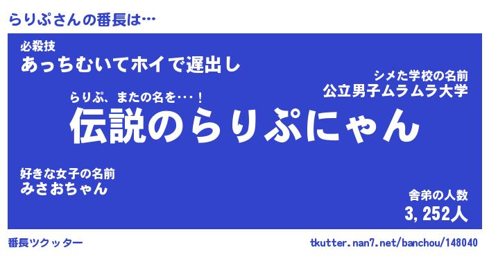 | 男性向けラノベタイトル風あだ名 | 『らりぷの憂鬱』 |