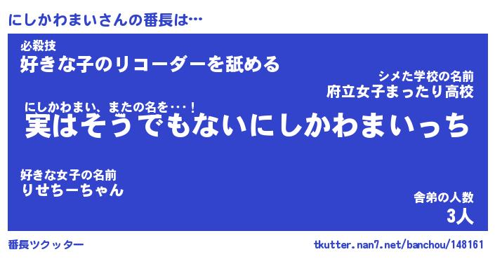 | 恥ずかしいあだ名 | 『プリティーにしかわまい』『にしっちょ』 |