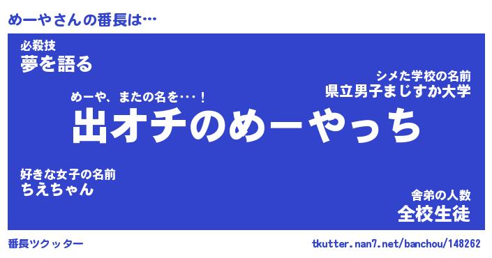 | 肩書あだ名 | 『めーや店長』『めーや国家主席』 |