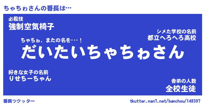 | 男性向けラノベタイトル風あだ名 | 『ちゃちゎの憂鬱』 |