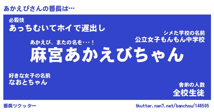 | 意味不明あだ名 | 『ペロリンあかえび』『永久保存あかえび』 |