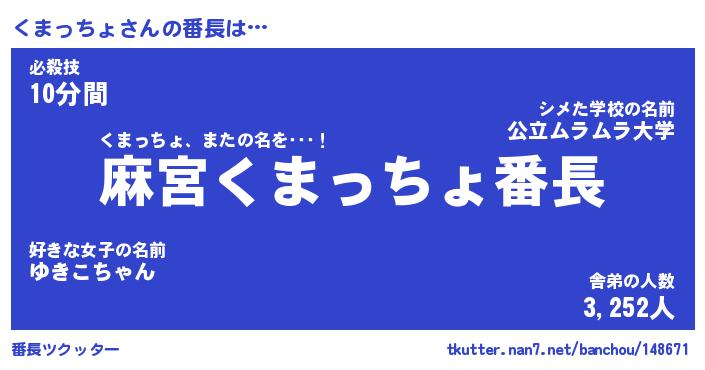 | 伝説のあだ名 | 『不死鳥のスナイパーくまっちょ』 |