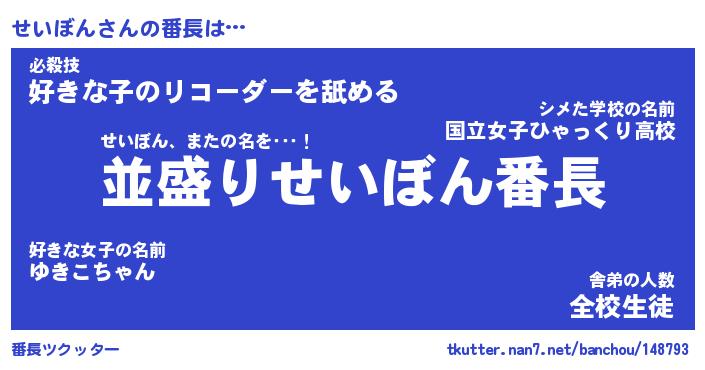 | 意味不明あだ名 | 『ペロリンせいぼん』『永久保存せいぼん』 |