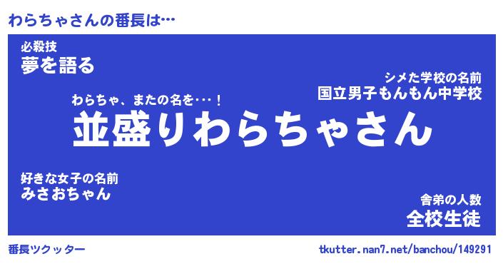 | 意味不明あだ名 | 『ペロリンわらちゃ』『永久保存わらちゃ』 |