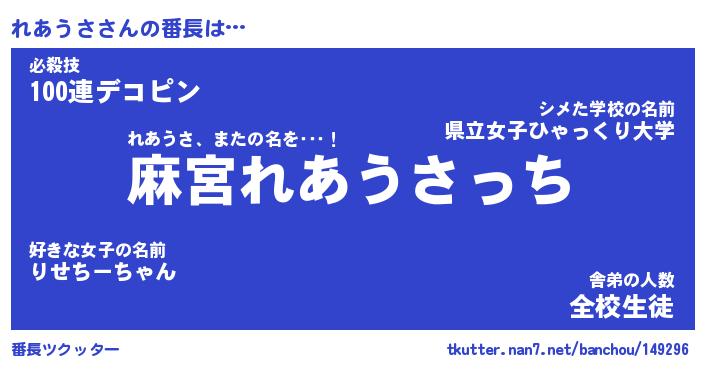 | 肩書あだ名 | 『れあうさ店長』『れあうさ国家主席』 |