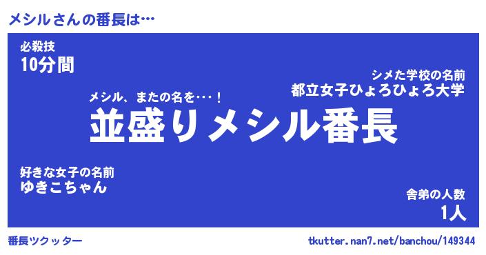 | ファンタジー風あだ名 | 『メシフェル』『エターナルメシルー』 |