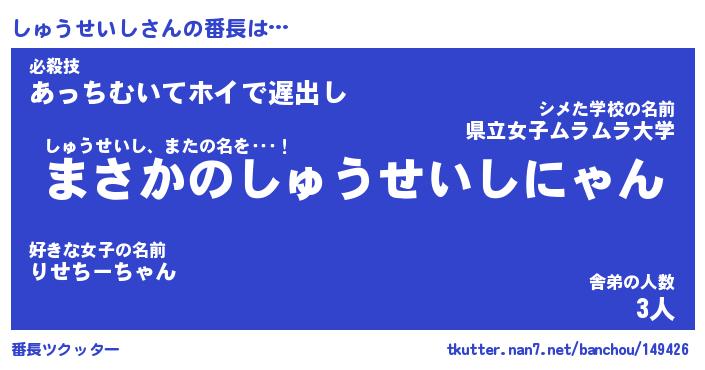| 恥ずかしいあだ名 | 『プリティーしゅうせいし』『しゅっちょ』 |