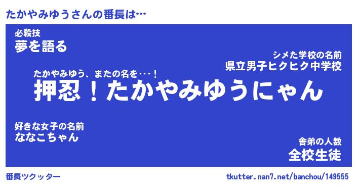 | 肩書あだ名 | 『たかやみゆう店長』『たかやみゆう担任』 |