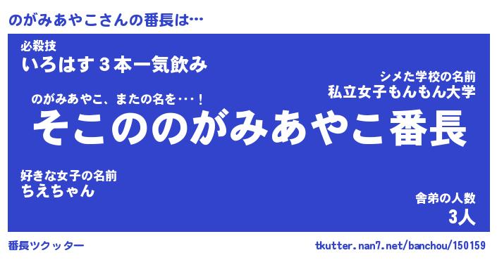| 肩書あだ名 | 『のがみあやこ店長』『のがみあやこ校長』 |
