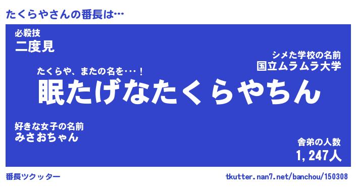| ヘコむあだ名 | 『たくにー』『酢こんぶ』『たくっぺ』 |