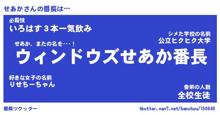 | 伝説のあだ名 | 『伝説のスナイパーせあか』 |